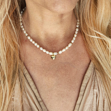 Materiały użyte do wykonania naszyjnika: perły naturalne w odcieniu bieli śmietankowej stal szlachetna. Zawieszka serduszko muśnięte złotem.
