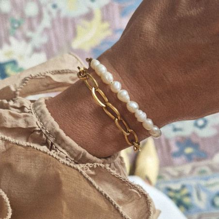 Bransoletka wykonana z pereł naturalnych oraz łańcuszka ze stali chirurgicznej.