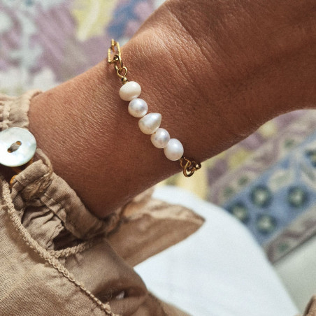 Bransoletka wykonana z pereł naturalnych oraz łańcuszka ze stali chirurgicznej muśniętego złotem (nie ściera się).