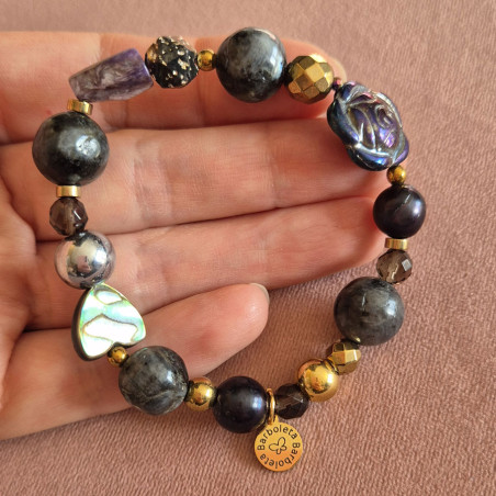 skład: Perły naturalne, labradoryty, hematyty, kwarc dymny,lawa wulkaniczna,muszla paua, agat, kwiat akrylowy. Elementy metalowe ze stali szlachetnej.