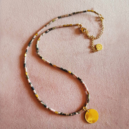 Sam wdzięk ! Rodonit o przepięknym ubarwieniu - różu oraz ciemnego grafitu. Zawieszka klasyczna okrągła monetka.